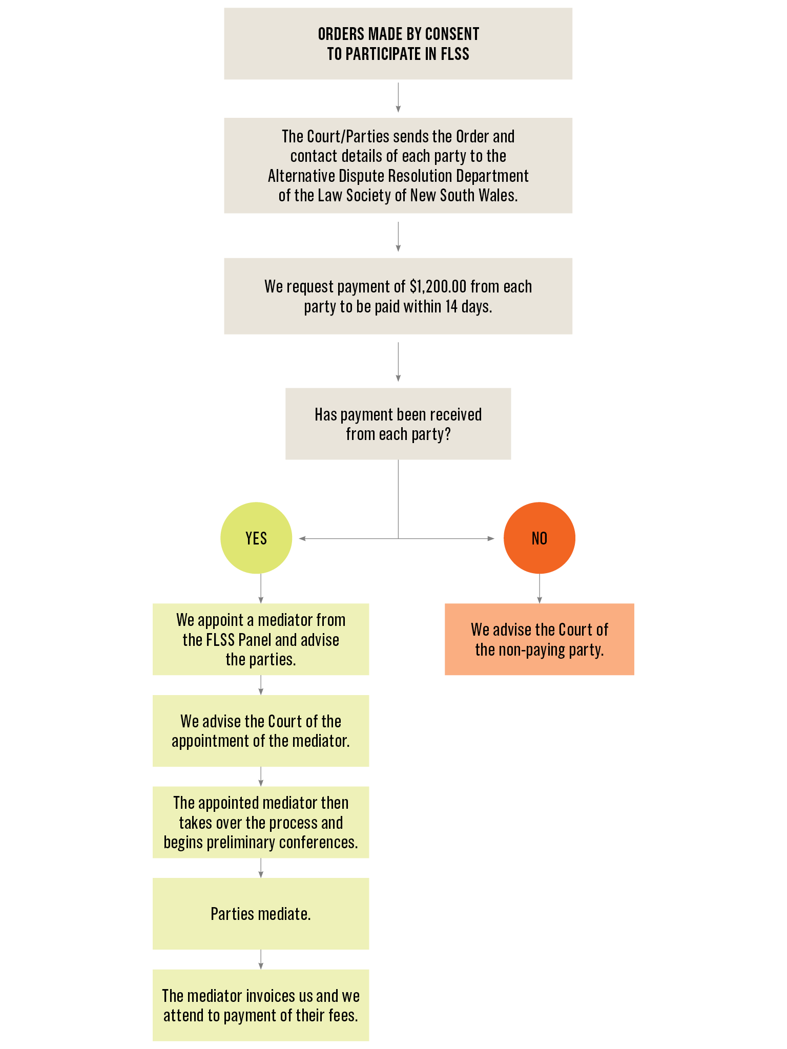 Parties participate in mediation to maintain control of the decision-making process and to make a good faith attempt to resolve their dispute. The mediator will provide a structure for parties to find common ground and discuss the issues in dispute. All agreements are made between the parties – there are no imposed decisions. Solicitors should refer to the FLSS process if they deem the program suitable for their clients.