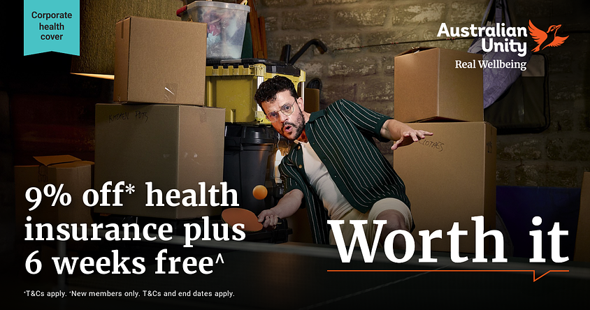 Save 9 per cent* plus enjoy 6 Weeks free^ with Australian Unity Corporate Health Insurance. T&C’s Apply